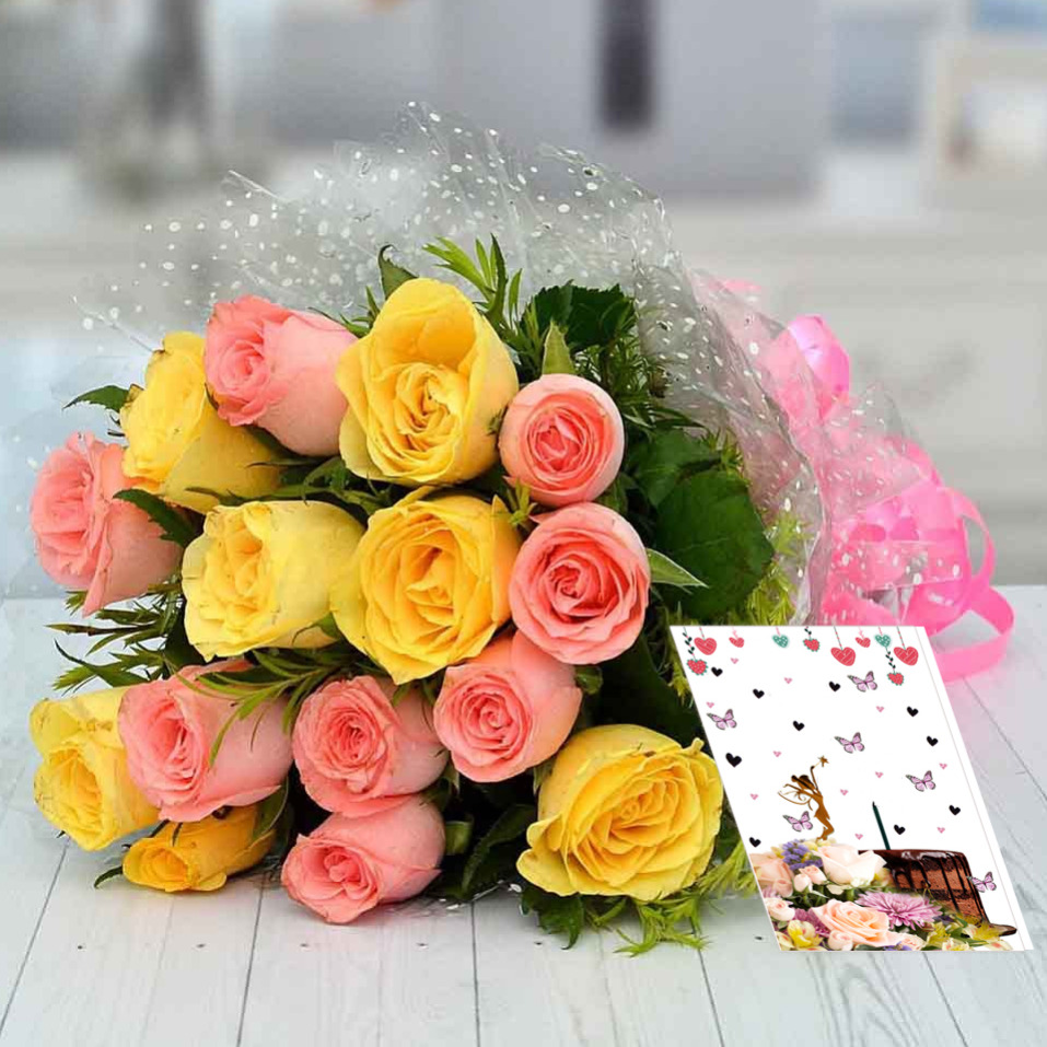Flowers with Greeting card is a best gifts to send any where in India.This Flowers Bouquet said everything for your feelings.send this hamper Now Products Contain :::: Round Bouquet of 15 Roses with greenery.(color: Pink, Yellow) Cellophane wrapping with Pink Ribbon. Greeting Card (Love)