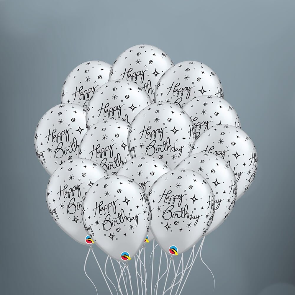 15 pieces High quality US branded silver sparkle birthday balloons filled with helium and weight in the bottom. Helium will last 6 to 8 hours