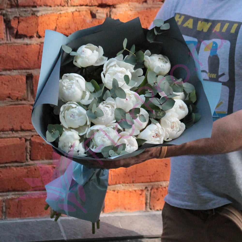 Bouquet '15 white peonies with eucalyptus'