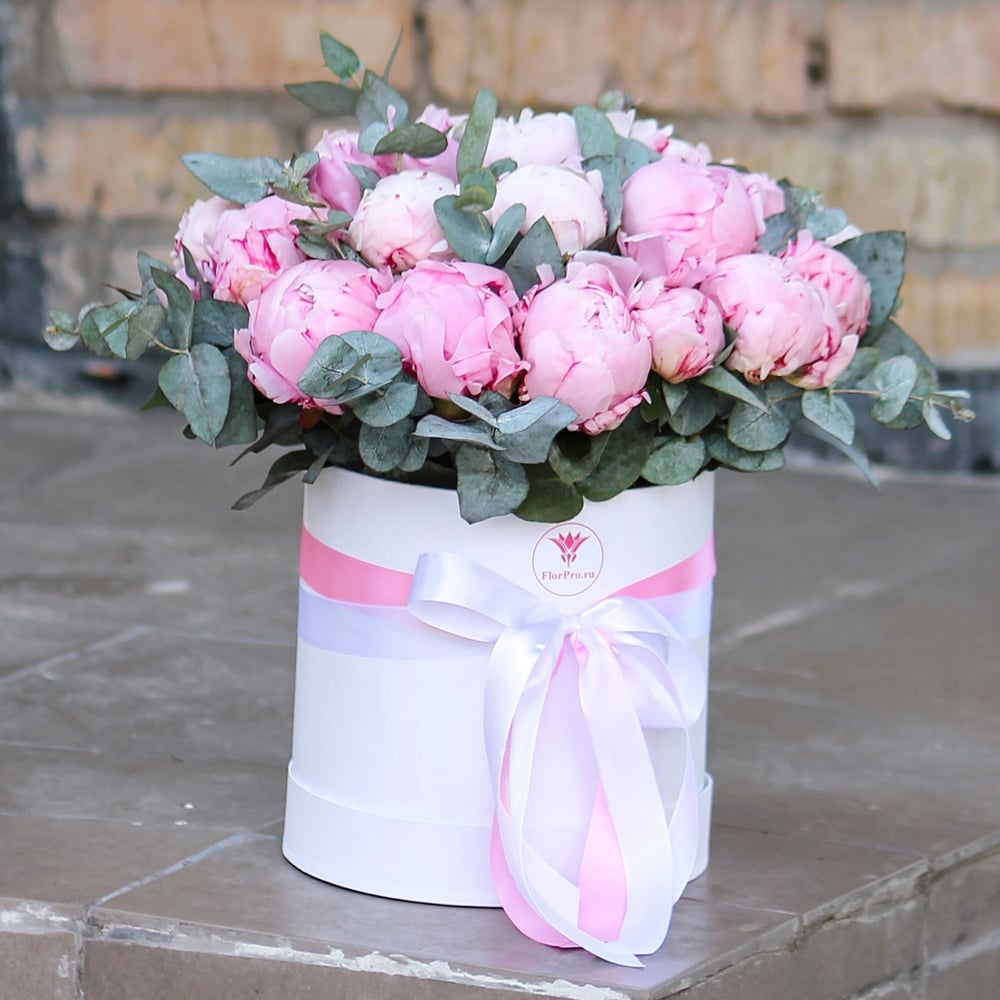 Hat box with flowers '25 peonies Sarah Bernhardt in a box'