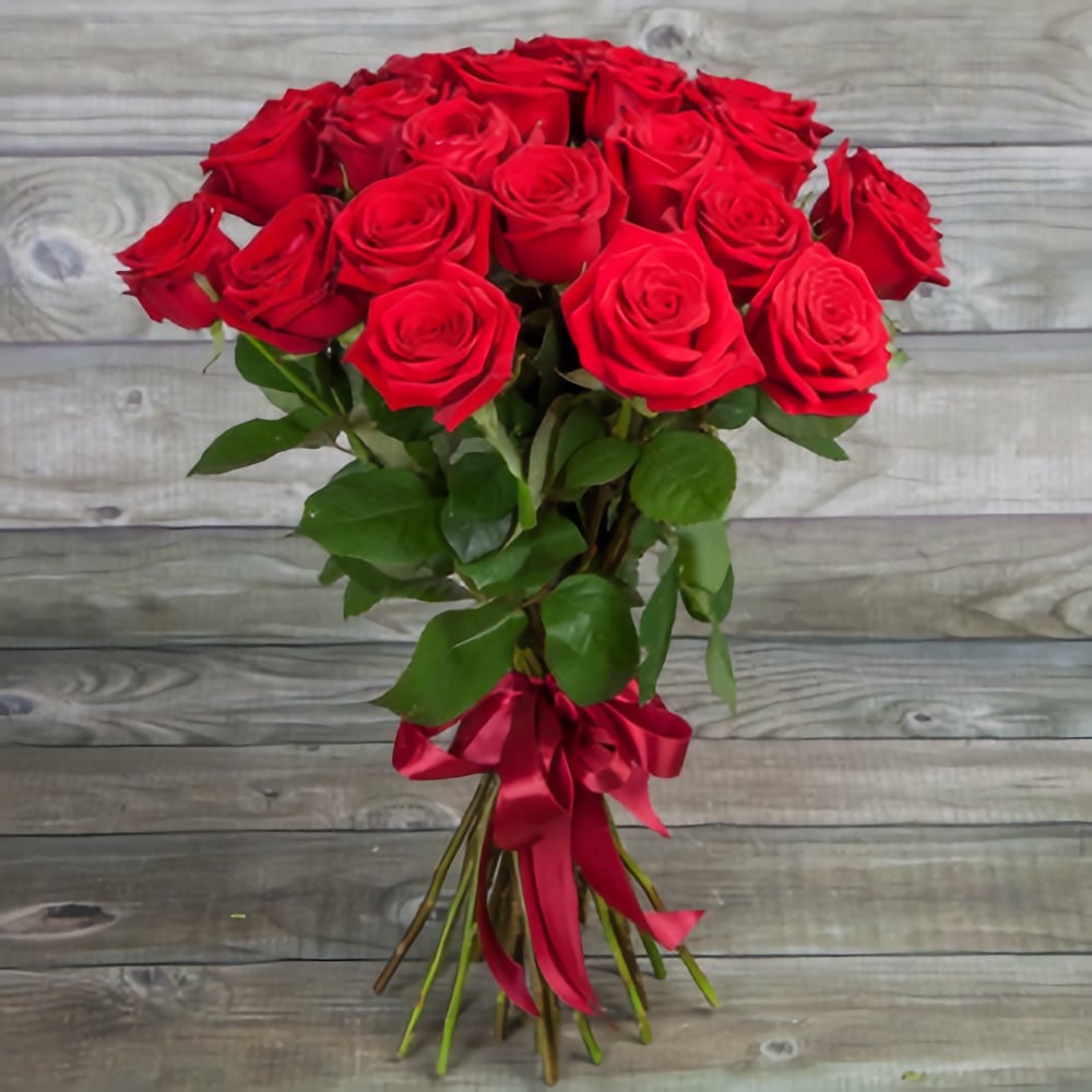 Gorgeous bouquet of 25 red roses tied with a satin ribbon.