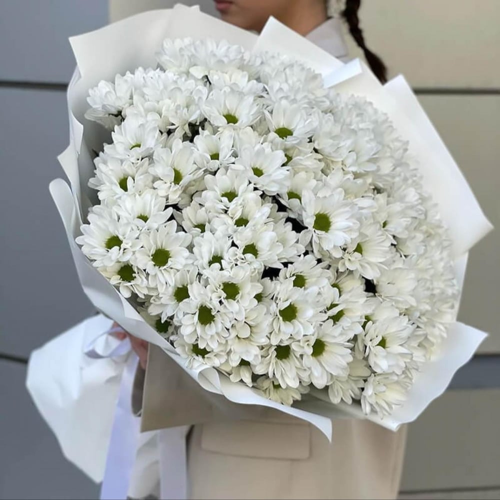 An incredibly beautiful cloud of white chrysanthemums with decoration - will be more than appropriate for a Birthday or anniversary. Also, with such a bouquet, one can confess their love. This bouquet will delight the recipient for a long time and will take the best place among other bouquets.