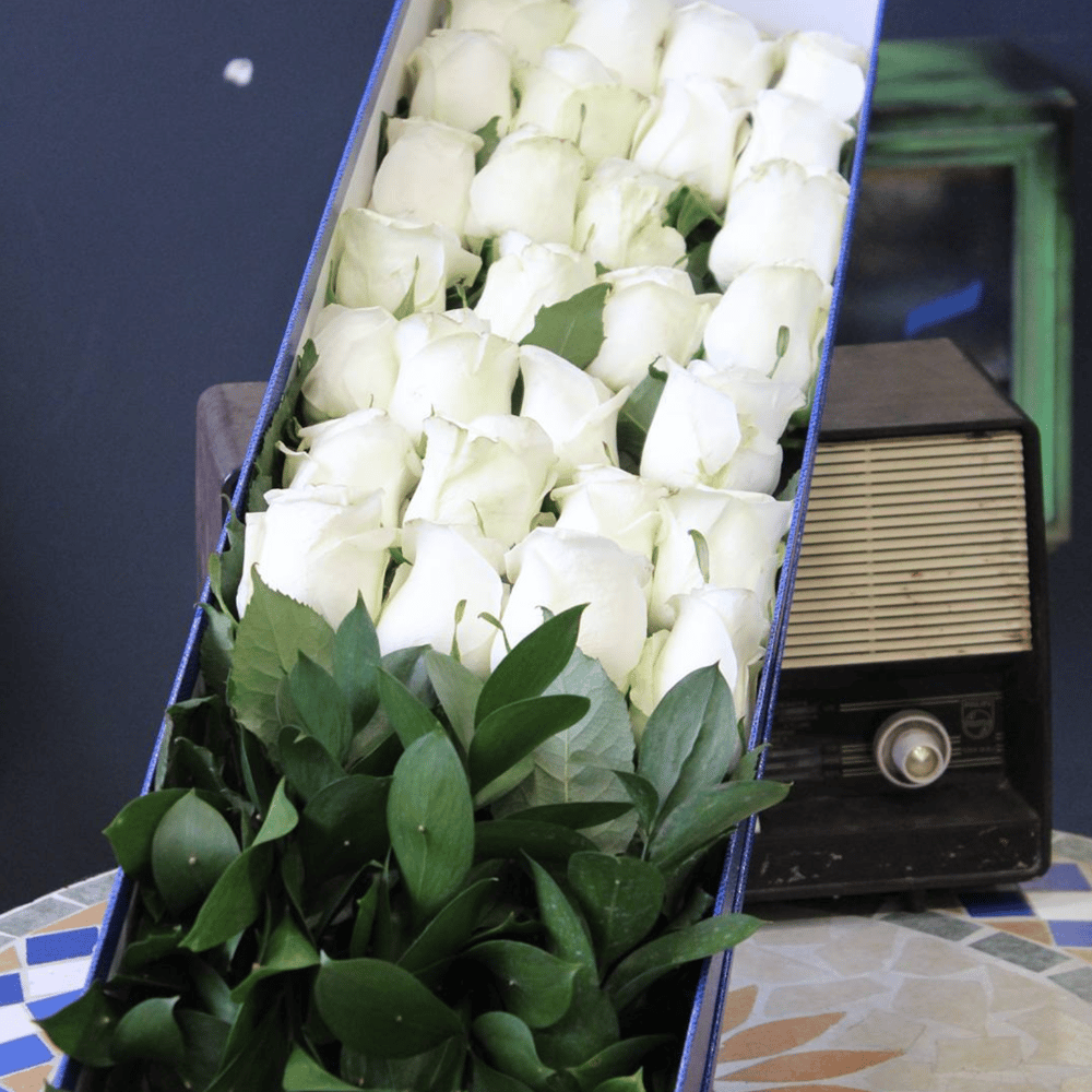 Arrangement '28 white roses in a box'