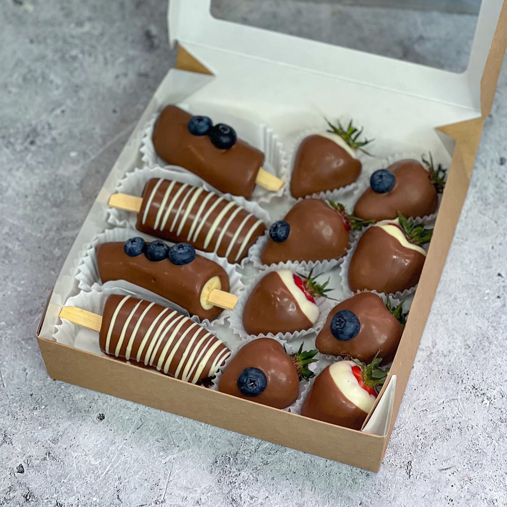 4 bananas and 8 strawberries in chocolate