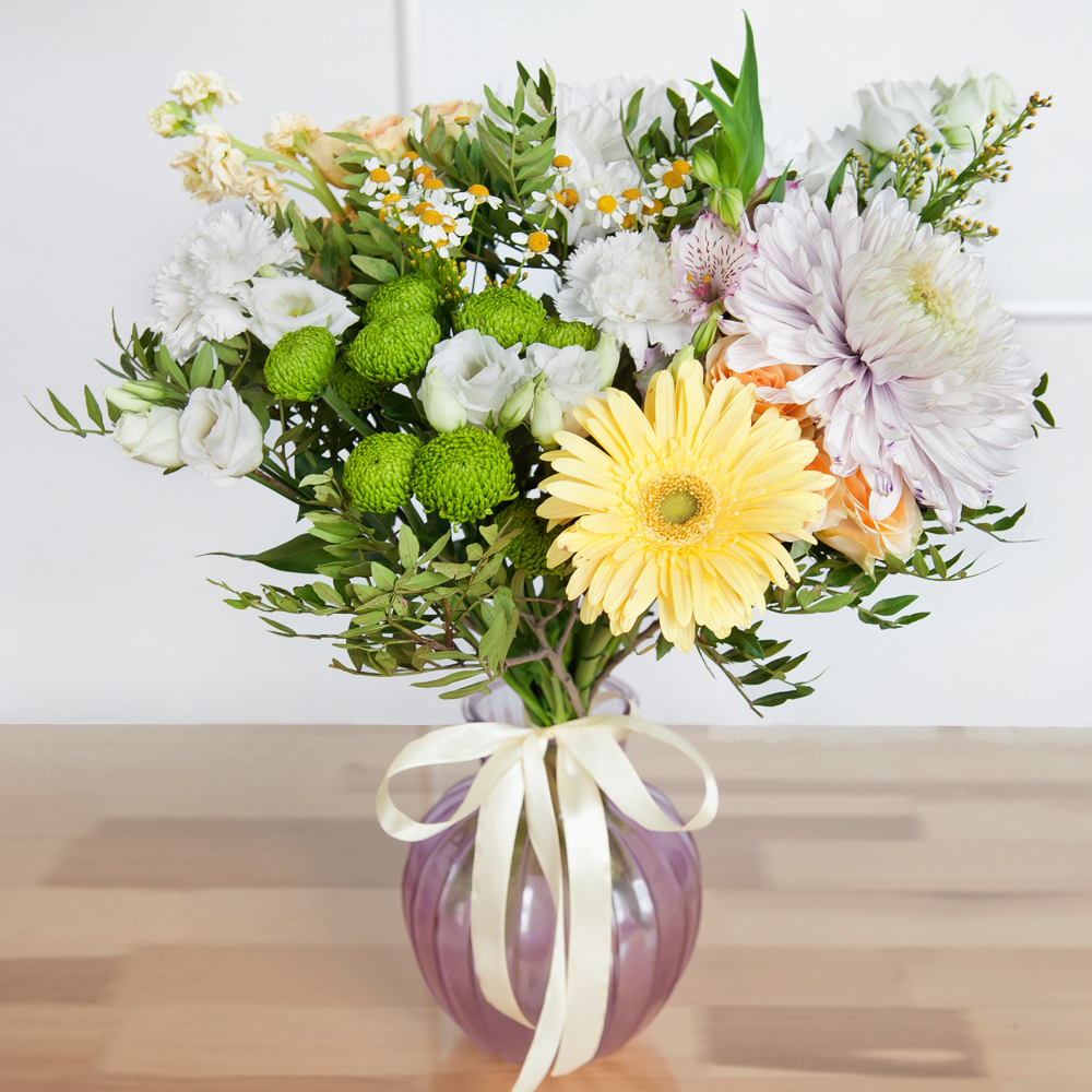 A mixed bouquet of seasonal flowers is available in the store for the same price, with the preservation of the color scheme, the number of flower stems, and foliage.