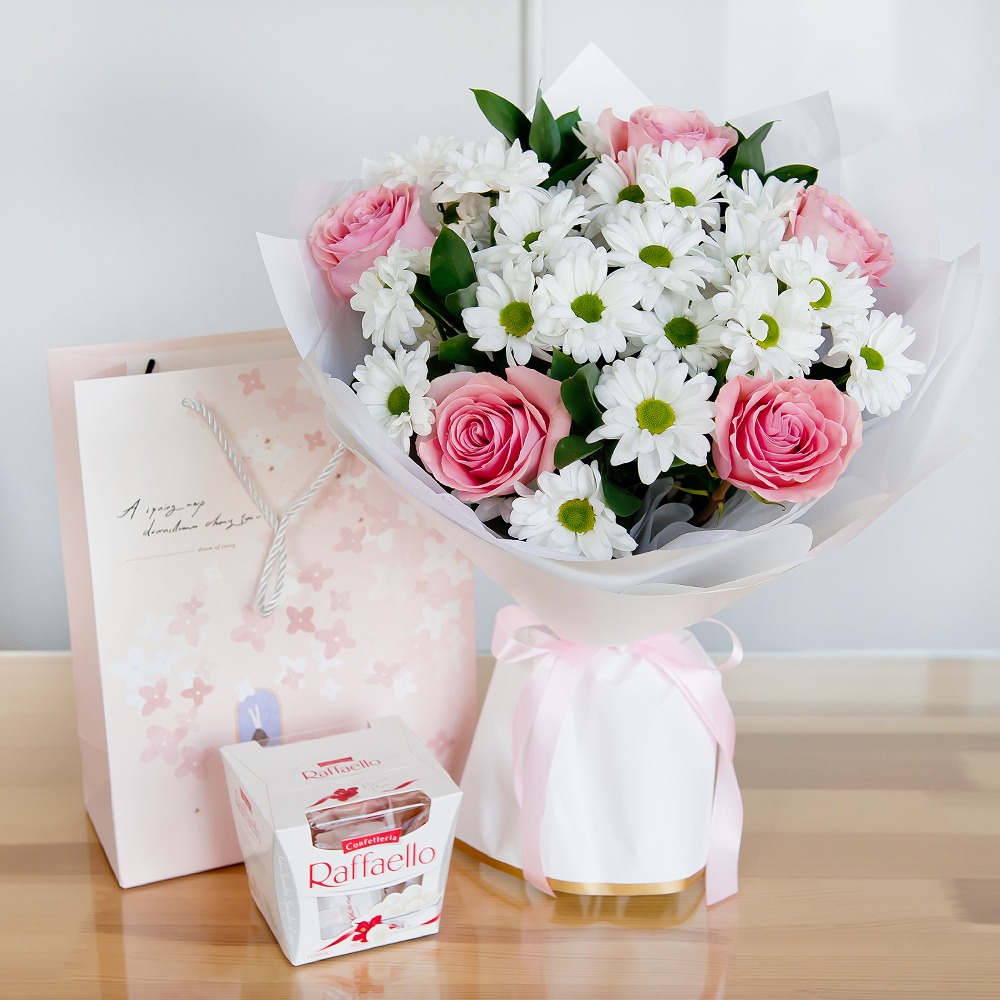 Our "Sweet Whispers" gift set is a delightful fusion of floral beauty and sweet treats. Pink roses and chrysanthemum spray, nestled among salal leaves, pair perfectly with a box of Raffaello candies. Presented in a modern package with a ribbon, this gift set is a whisper of affection that speaks volumes.