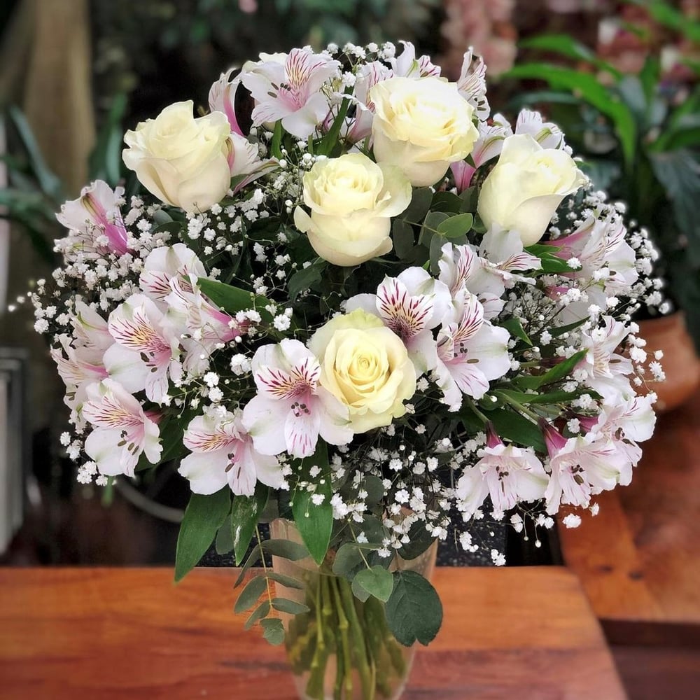 A bouquet of white roses, alstroemeria and gypsophila, as delicate as a cloud, will make a lasting impression on the recipient.