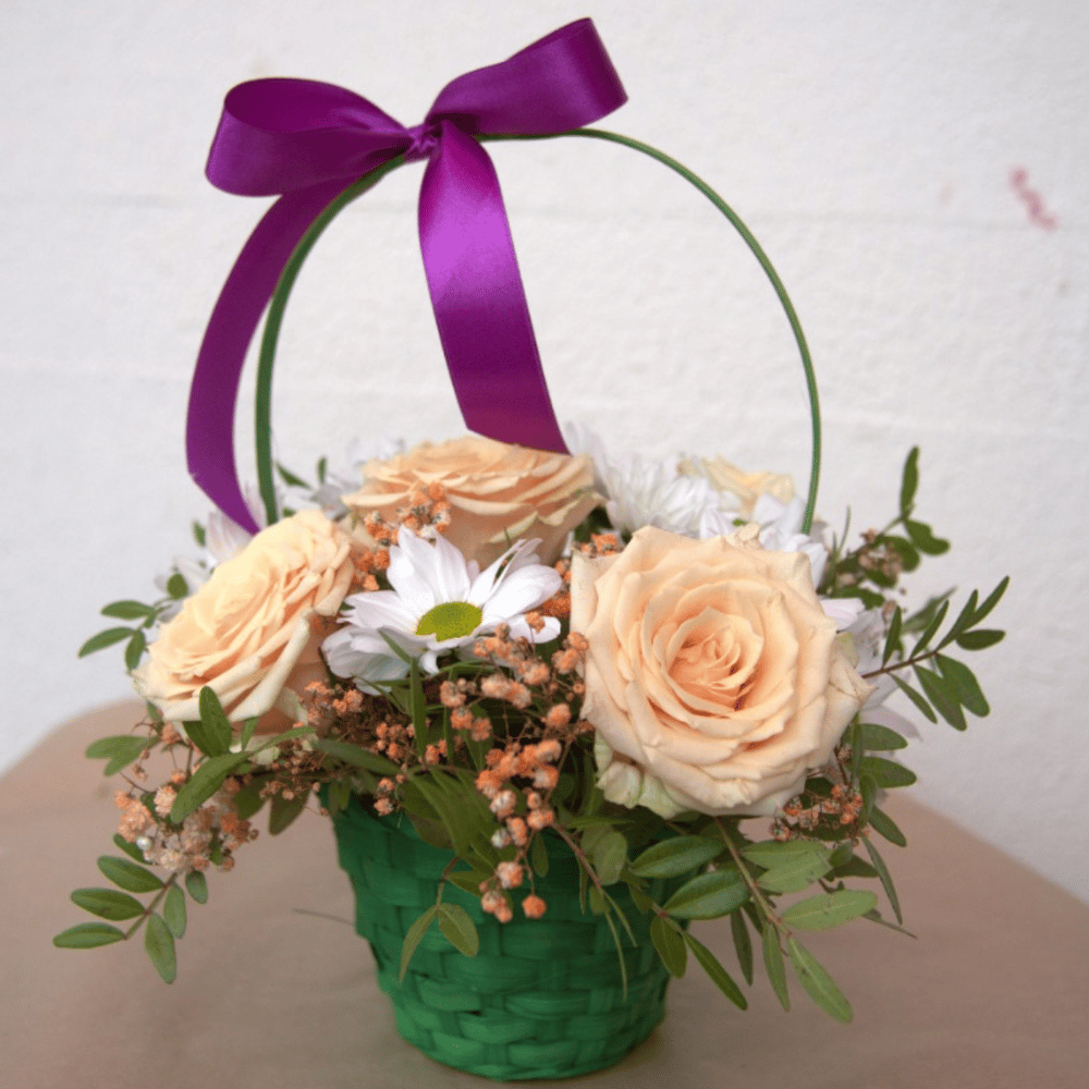 Flower basket 'Arrangement of roses and chrysanthemums in a basket'