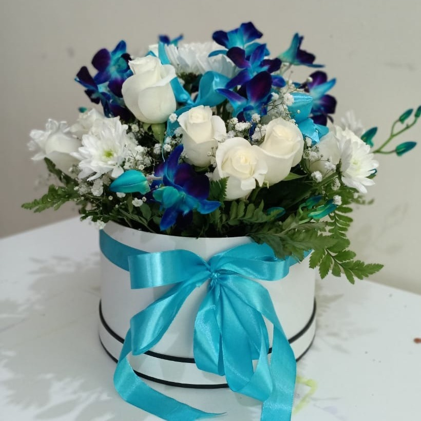 A chic hatbox made of azure-colored orchids is a great occasion to please a loved one.