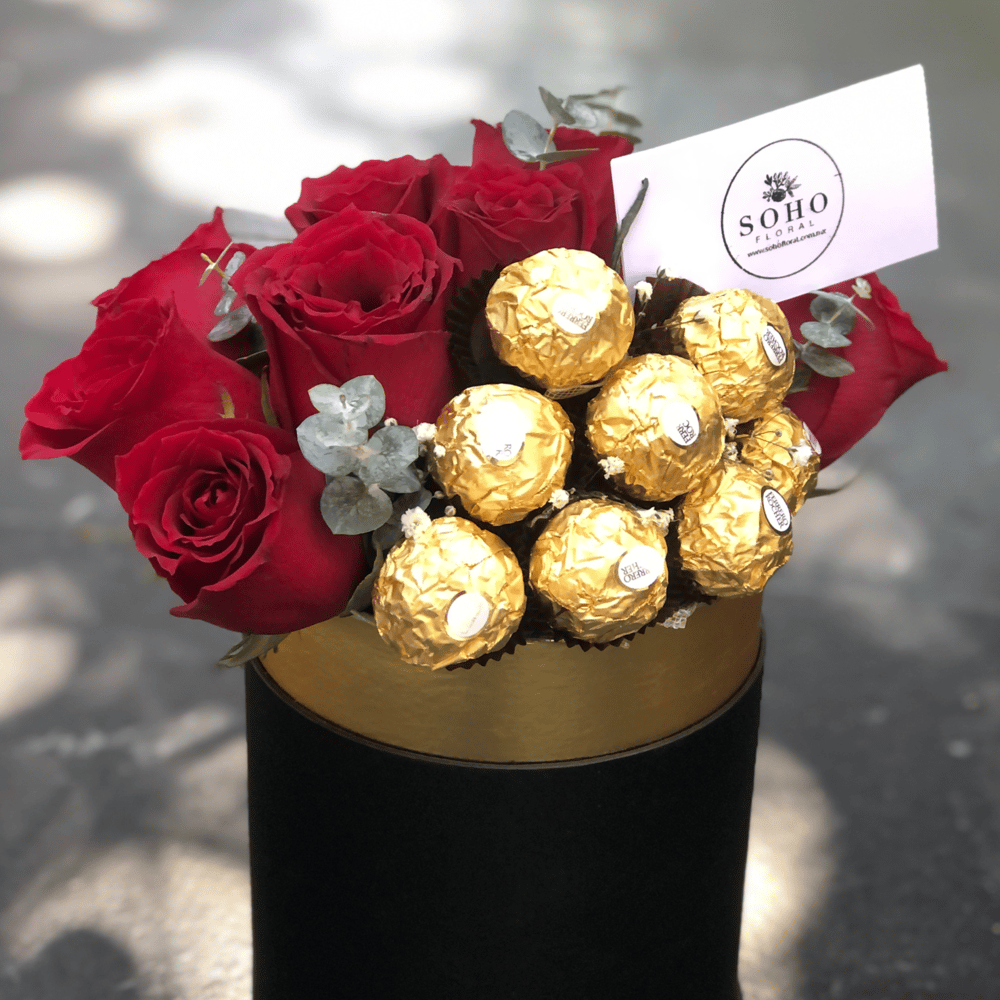 premium circular floral box with a dozen red roses and 8 Ferrero chocolates