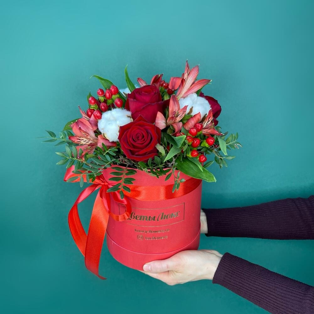 Hat box with flowers 'Beautiful red'