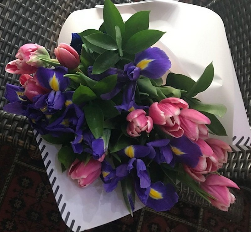 A delicate spring bouquet of tulips and irises will be the most pleasant compliment.