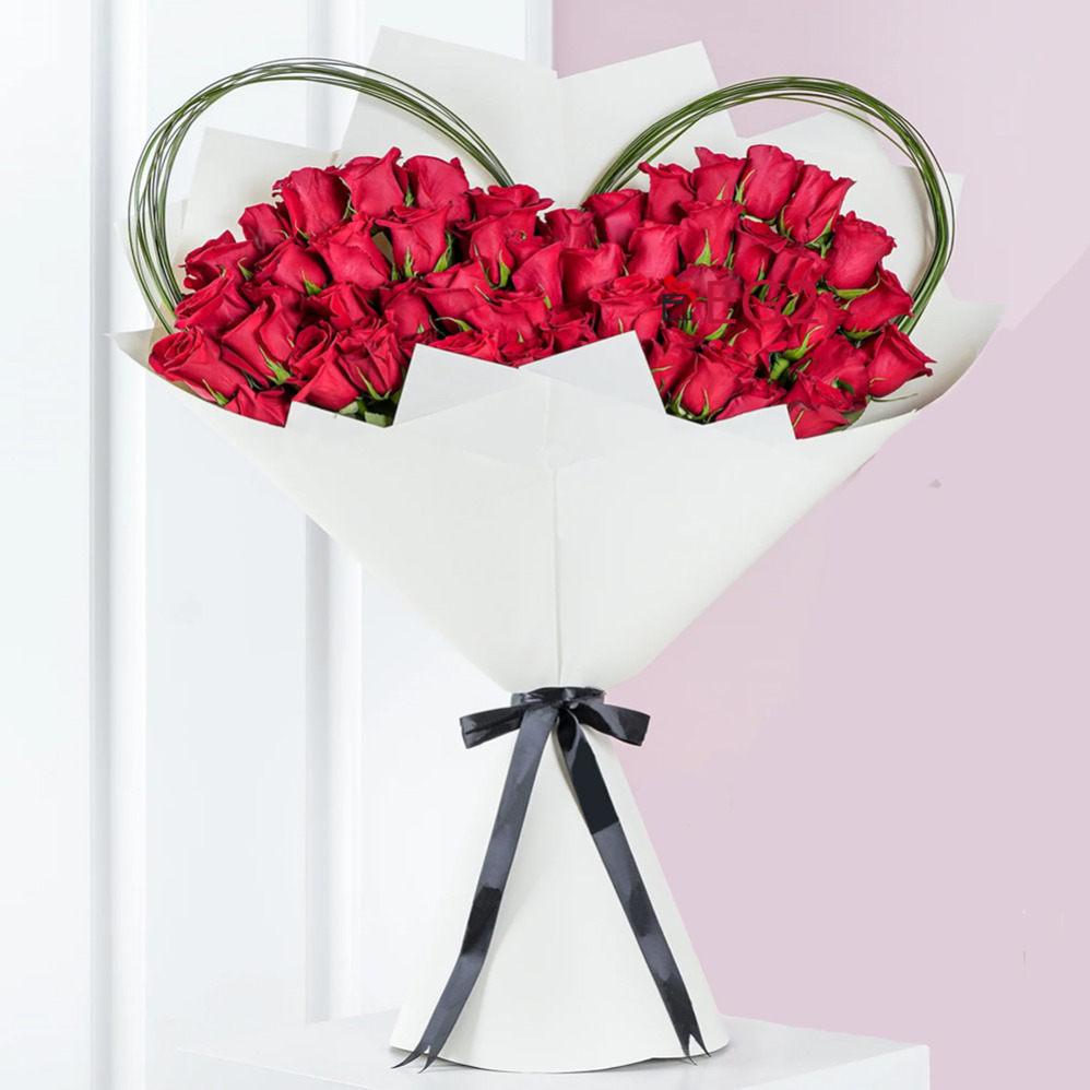 Red Roses is a symbol of love and Send This Execlusive Red Roses Bouquet anywhere in India for his/her birthday, anniversary, Valentines, mothers day or any other occassions. Product Details:: EG2i2580 One Side Bouquet of Red Roses. One side bunch of 75pcs Red Roses With White paper wrapping Black Ribbon bow and Green Leaves. Free Personalised Message Card.