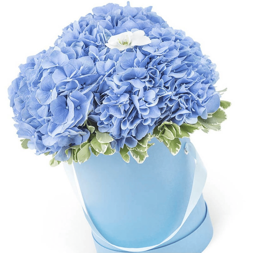 Hat box with flowers 'Blue Lagoon'