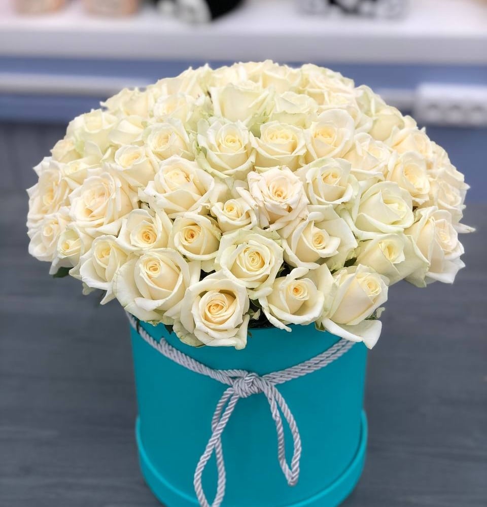 Hat box with flowers 'Bouquet of 101 roses "White and blue"'