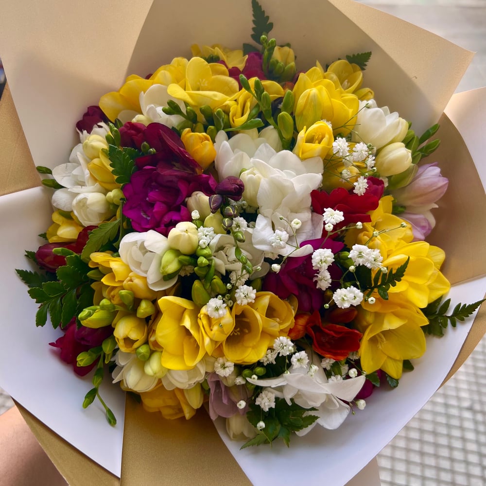A stunning bouquet of 25 fresh freesias.