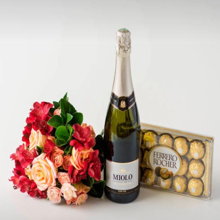 Em cores suaves, rosas e astromélias trazem o significado de amizade e felicidade plena. Nesse buquê, acompanhado por bombons e champanhe, se tornam opções ideais para presentear a pessoa amada.