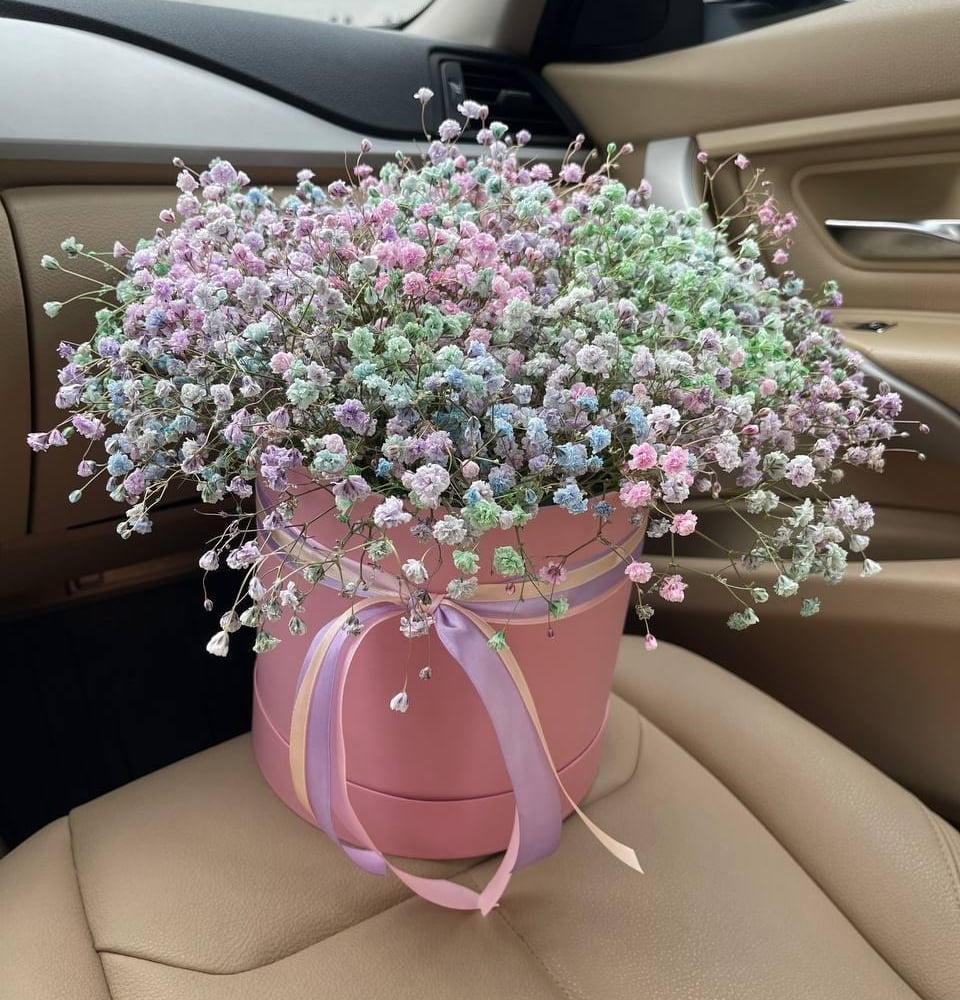 Hat box with flowers 'Bouquet of gypsophila in a box "Flirt"'
