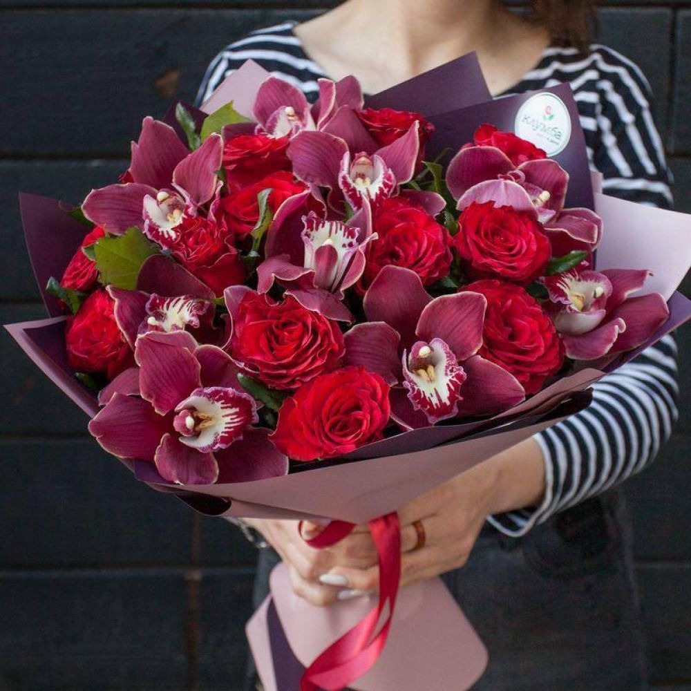 Bouquet of roses and Beaujolais orchids
