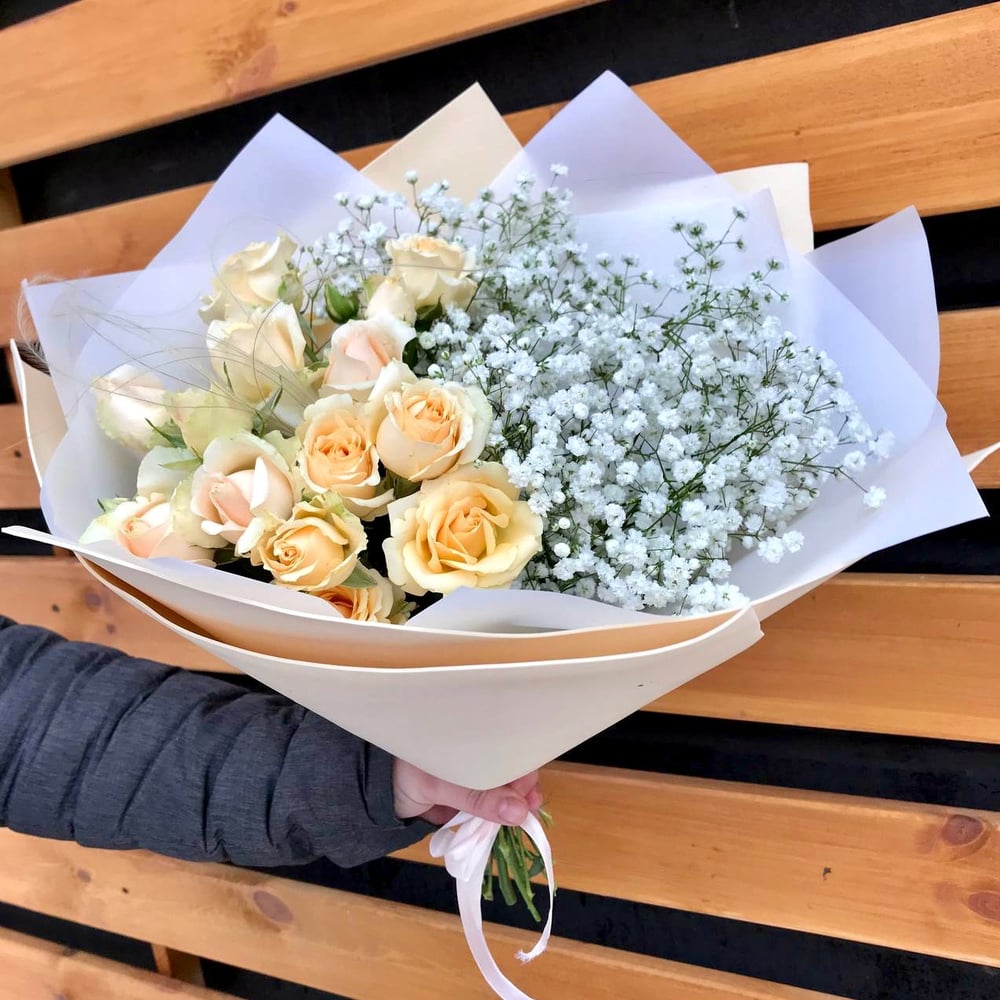 Bouquet of spray roses and gypsophila