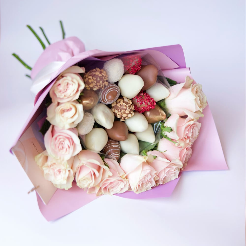 Indulge in the perfect blend of romance and sweetness with our Strawberries and Roses bouquet. This stunning arrangement combines luscious, fresh strawberries with elegant, vibrant roses, creating a unique and memorable gift. Order now to delight your loved one with this exquisite bouquet!