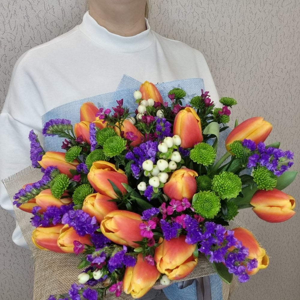 Bouquet of tulips, chrysanthemums and statice