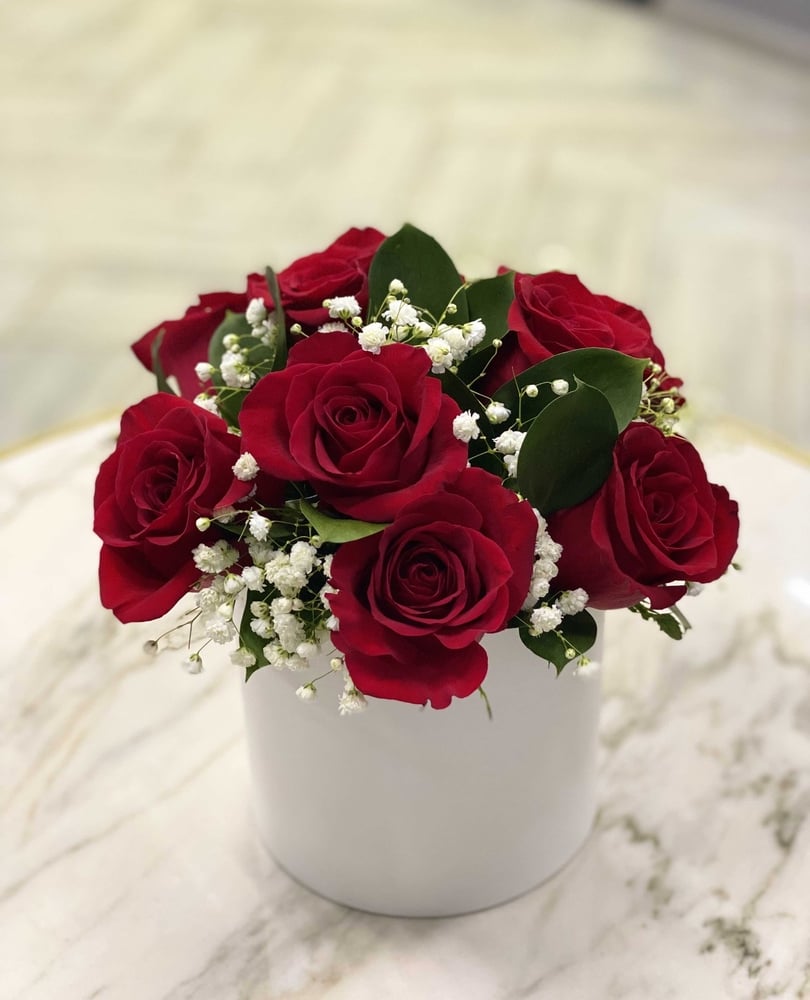 Hat box with flowers 'Box with red roses and gypsophila'