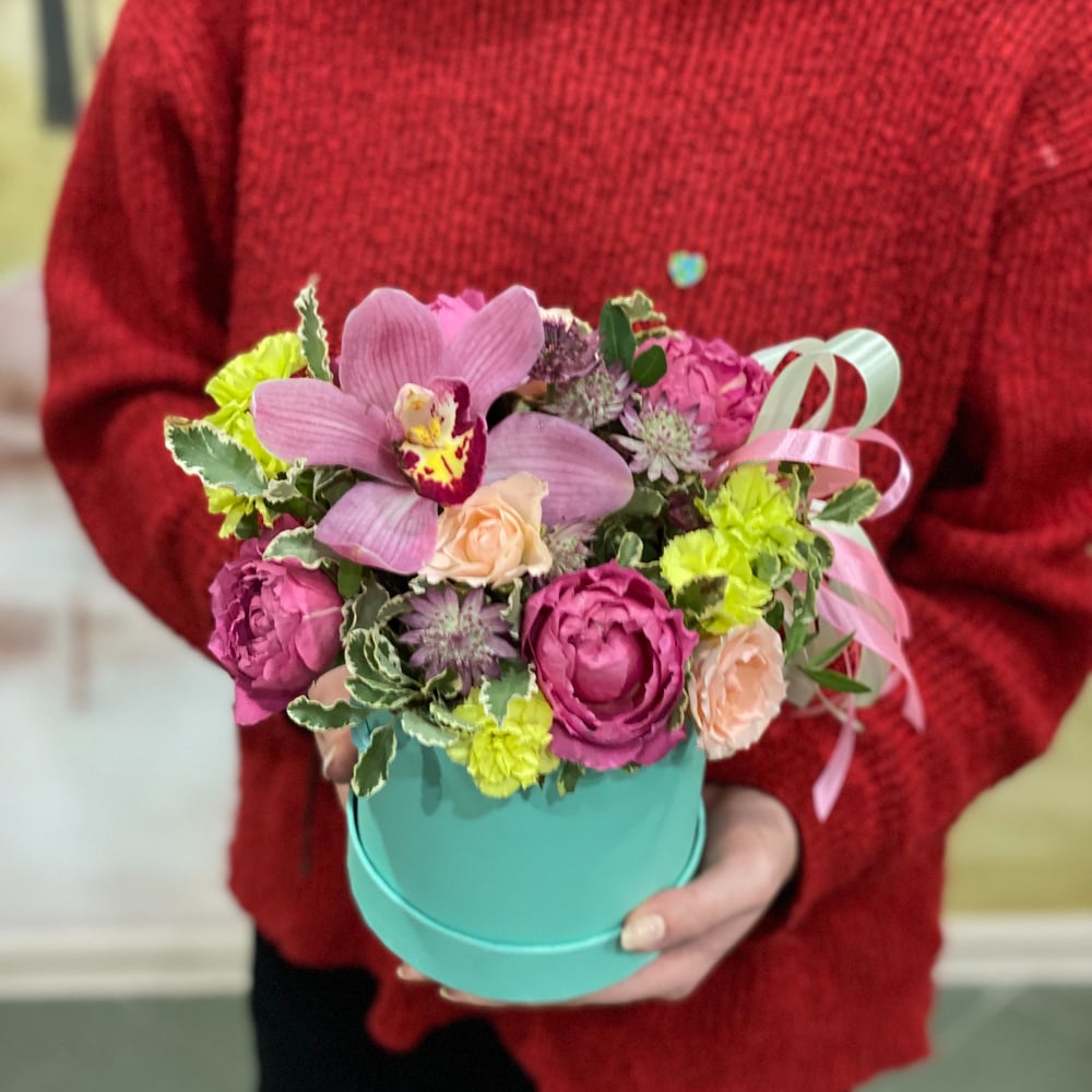 Hat box with flowers 'Bright colors'