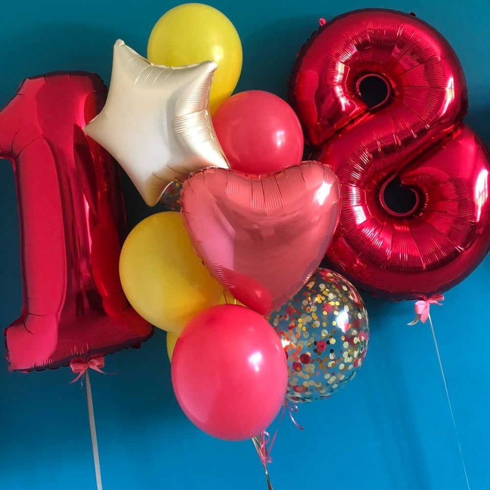 Bright fountain of 11 balloons