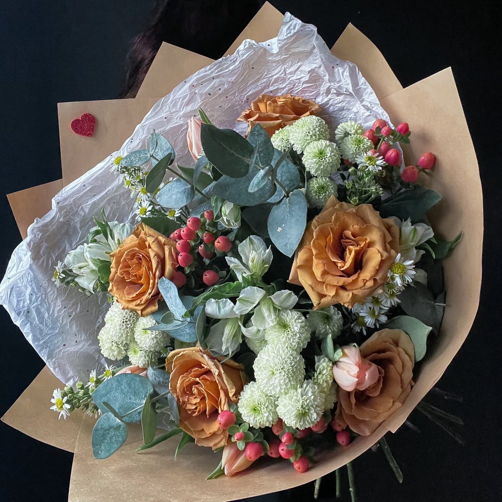 Bouquet features mums, roses, alstromeria, greenery, eucalyptus. The size is Small. The high is 50sm. Note: We are working with the fresh seasonable flowers, so the composition of the bouquet may a bit vary. Even in the absence of a seasonal flower - we try to collect a bouquet as similar as possible. If a particular flower is important for you - please, contact us with the note and we will agree on the options with you.