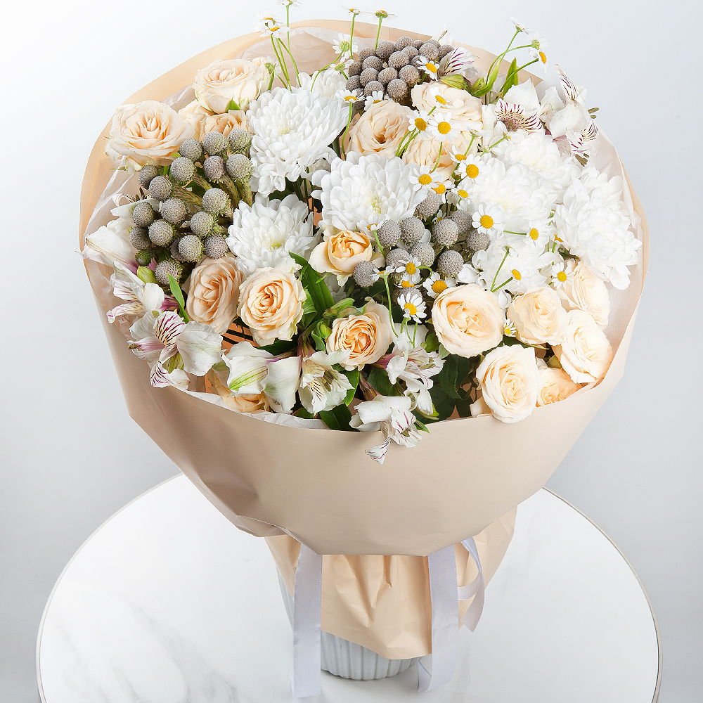 Enjoy the beauty of a sweet and bright caramel rainbow. Bush roses, chrysanthemums, alstroemerias, tansy, and brunia create a cheerful and delicate composition. Modern packaging emphasizes the beauty of this bouquet, which will be a wonderful surprise to lift the mood and express your feelings.