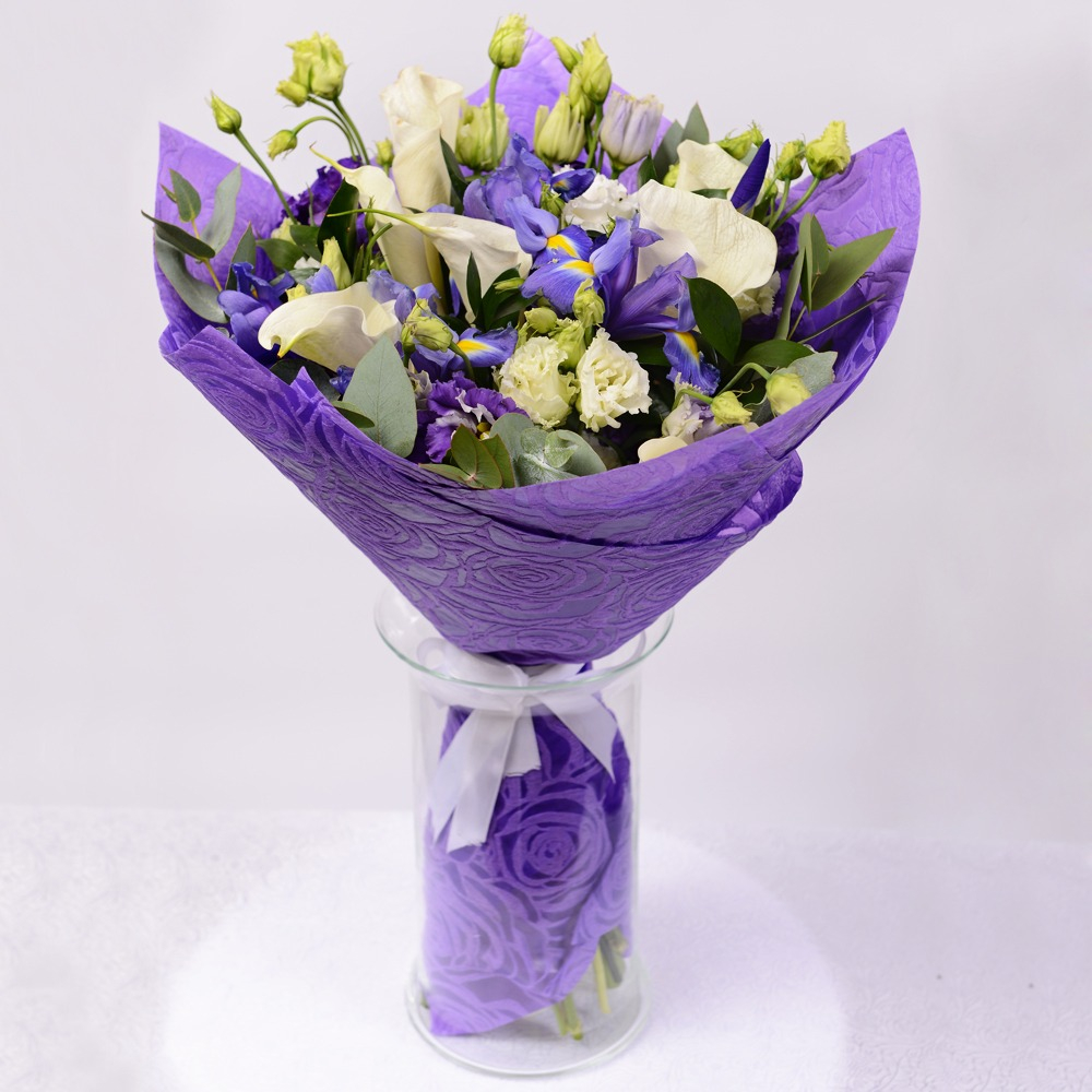 Tender and romantic bouquet of irises, lilac lisianthuses and calla lilies will make a luxurious gift for any occasion and will definitely impress your recipient.