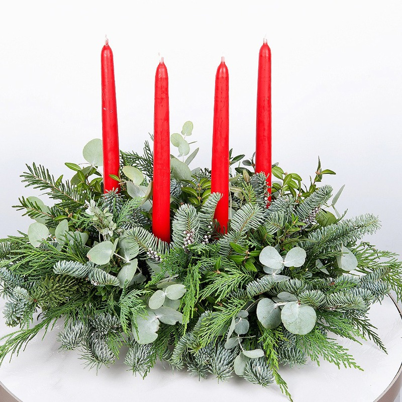 A classic Christmas candle centerpiece designed to bring warmth and elegance to your festive table. Four tall red taper candles rise beautifully from a lush bed of fresh winter greens including fir...