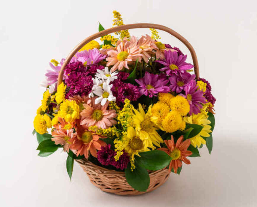 With colorful daisies, this basket is perfect for bringing joy to someone and liveliness to any space. Delicately wrapped with ruscus and tango, the beauty of these flowers draws even more attention.