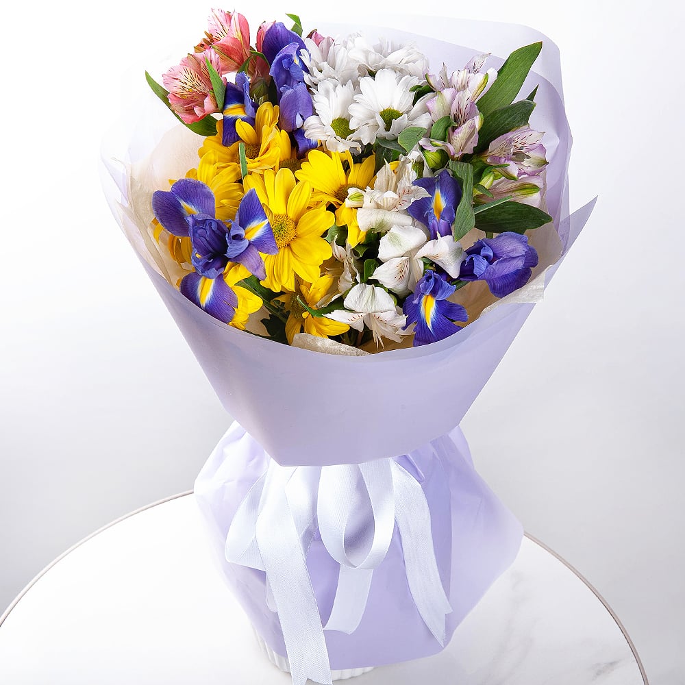 Bursting with joy and vibrancy, this bouquet features lush spray chrysanthemums, bright irises, and delicate alstroemeria. The fresh color palette is complemented by refined packaging and an elegant satin ribbon, making it the perfect choice for bringing happiness to any celebration.