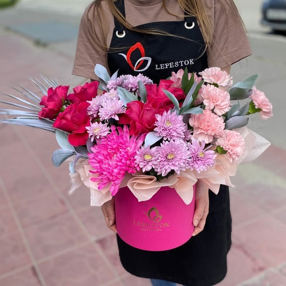 Hat box with flowers 'Composition in pink'