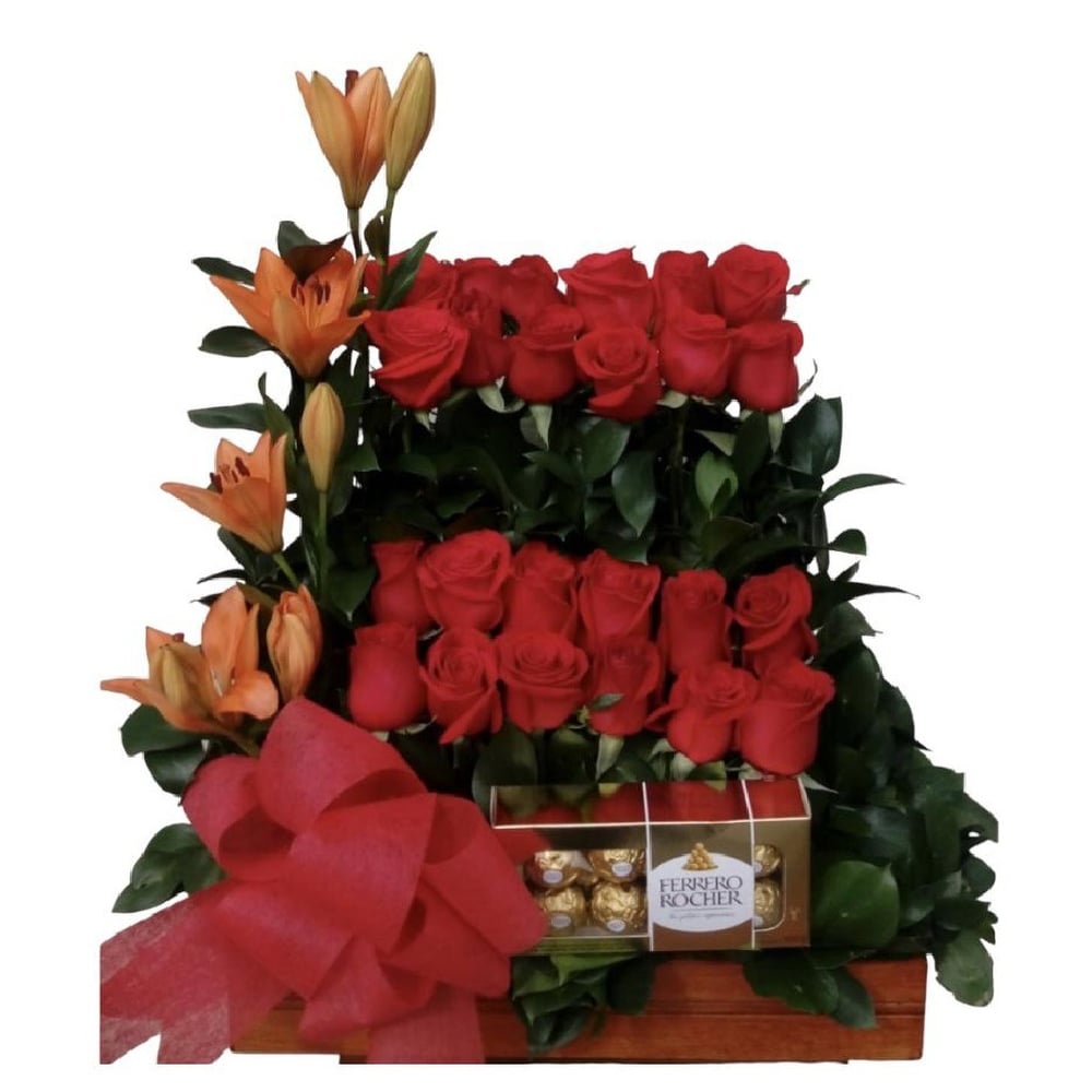 24 roses with assorted foliage on a wooden base with a bow and 8 delicious Ferrero chocolates in a box