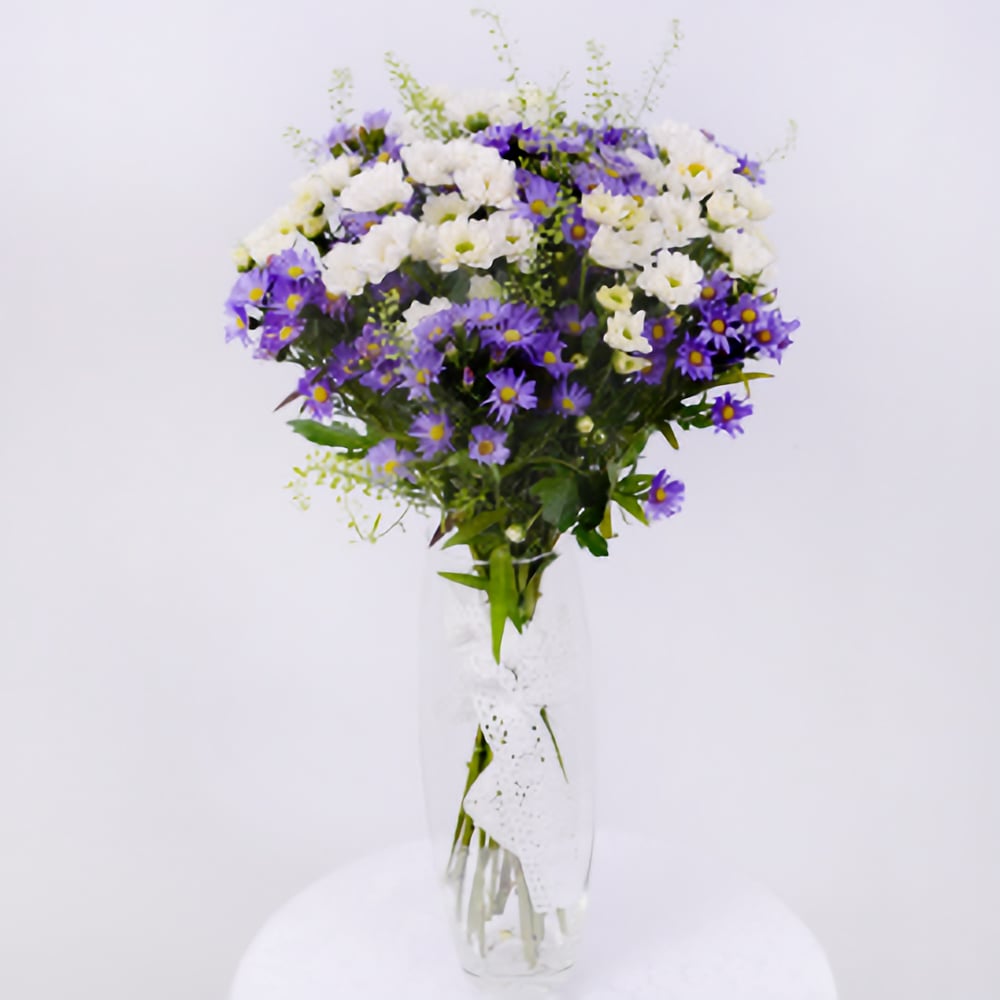A delightful bouquet of white and blue delicate flowers charms with its magnetic mystery. Light as a spring breeze, these flowers will surely touch their lips with light and dreamy smile. Express your sincere and tender feelings with this modest, but wonderful arrangement.