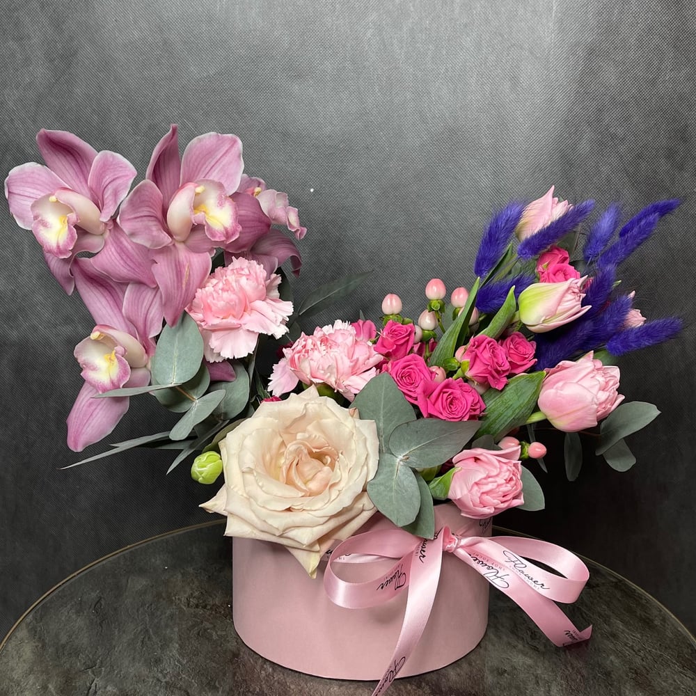 Hat box with flowers 'Cupid's arrow'