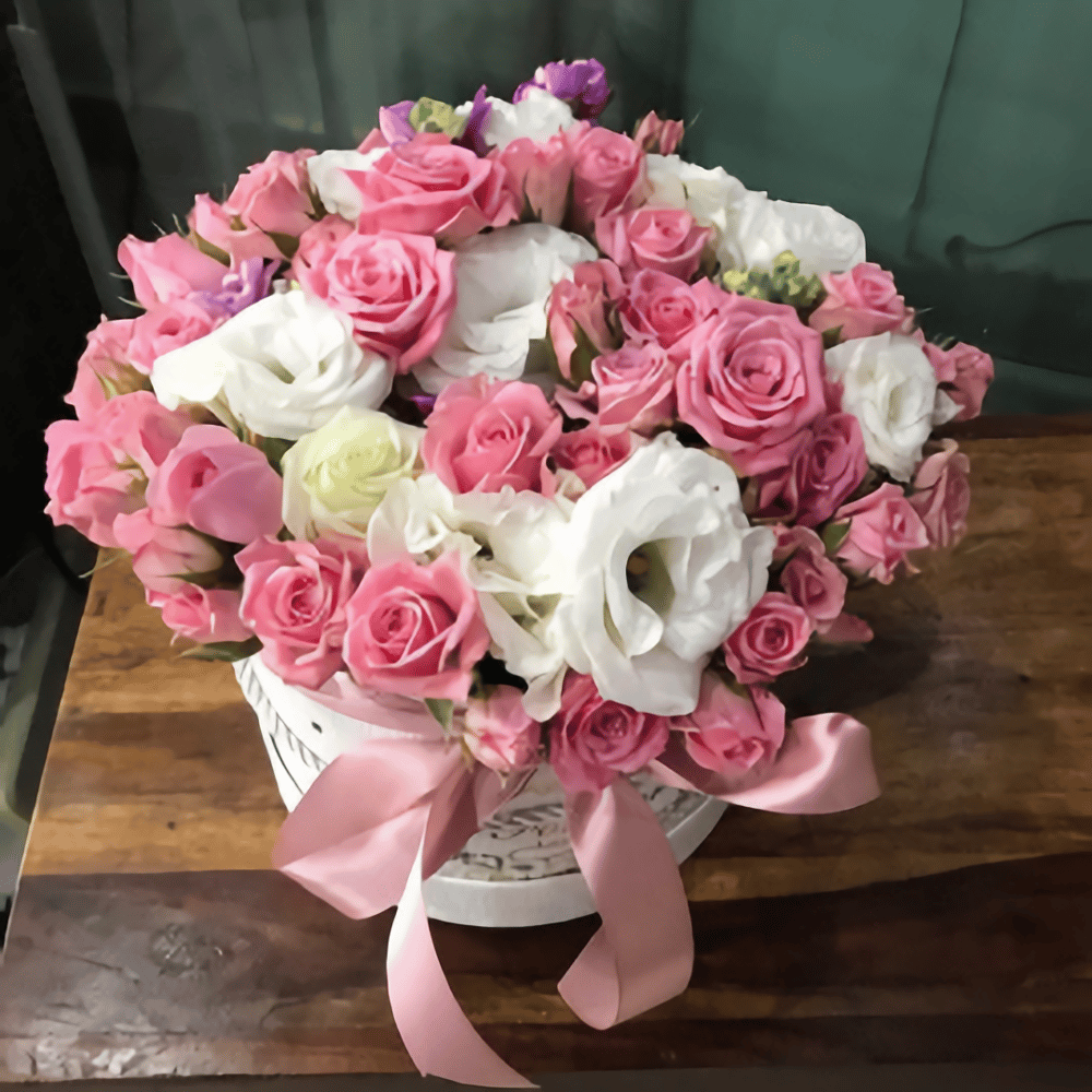 The bouquet in the hat box "Dance with Me" is the embodiment of tenderness and passion, the perfect choice for the most important moments. The bouquet is composed of spray roses, lisianthus, and r...