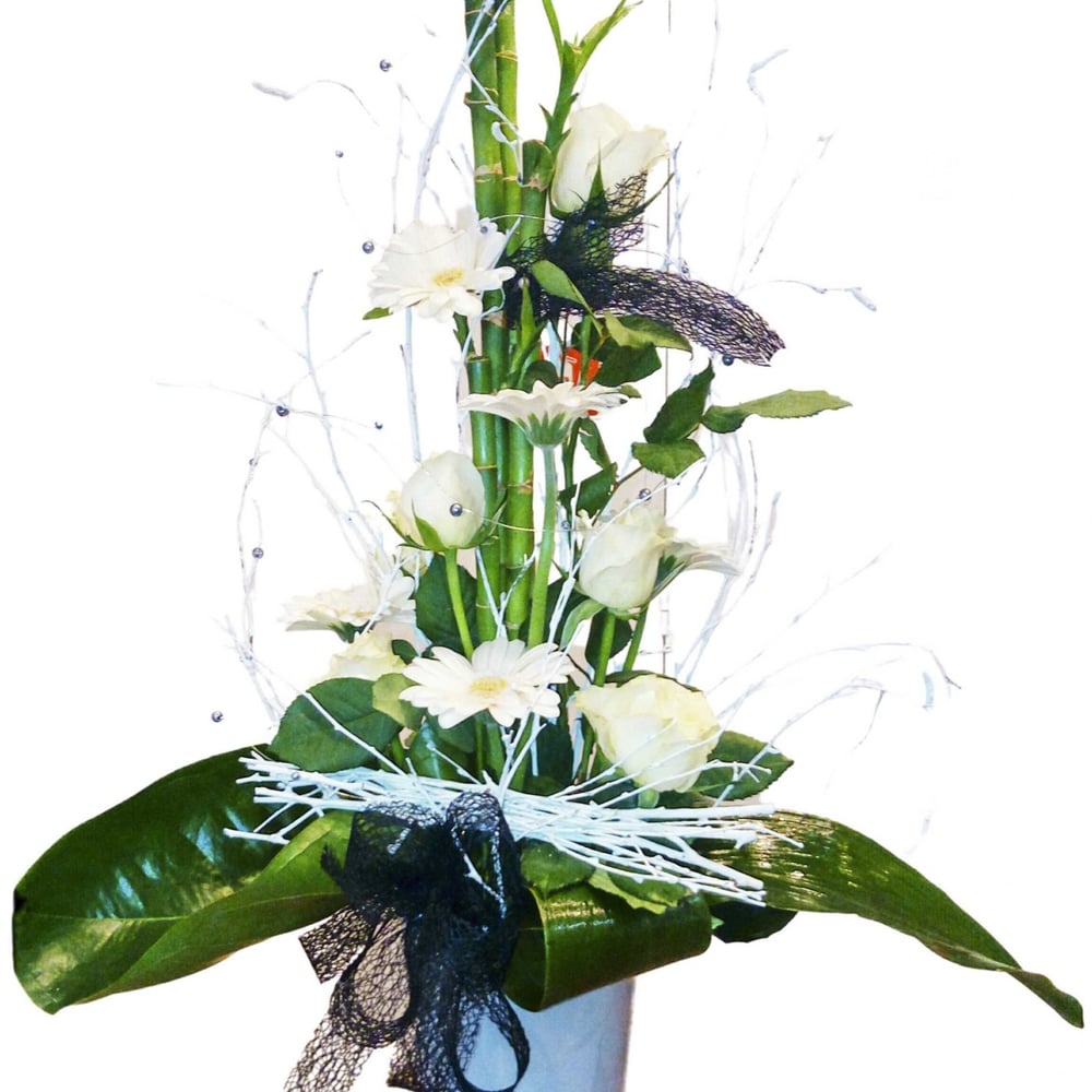 Beautiful contemporary flower composition, with slender lines and pure tones, green and white.