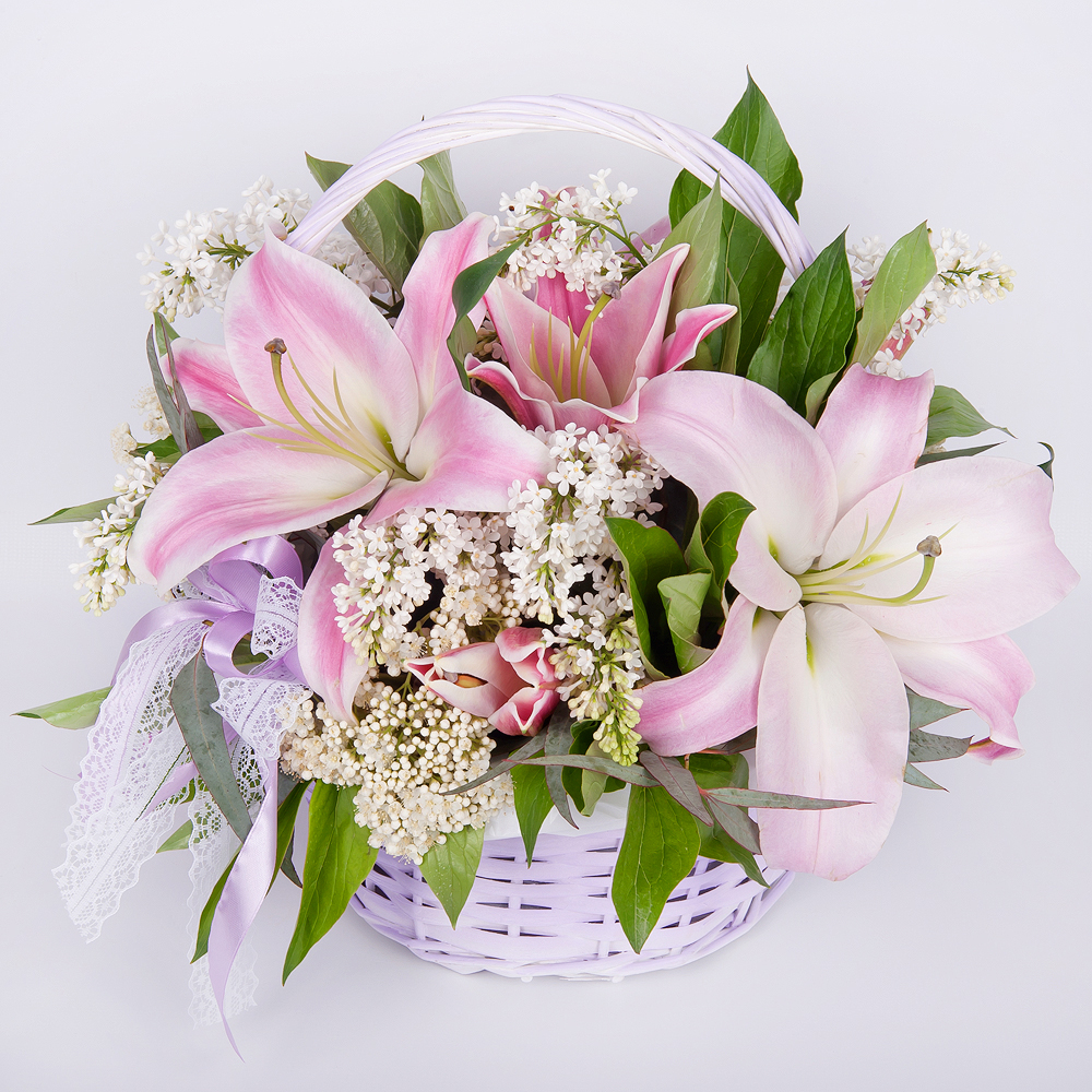 The "Elegant Features" bouquet is the embodiment of tenderness and grace, created from lilies and lilacs. The "Elegant Features" bouquet is crafted by experienced florists using only fresh flowers. It will delight the recipient with its beauty and fragrance for several days. The "Elegant Features" bouquet will make a wonderful gift for a birthday, wedding, anniversary, or celebration, and can also be used as a token of attention or gratitude. This bouquet is not only beautiful but also unique. It combines different shades and shapes, creating a unique composition that will emphasize your care and attention. The "Elegant Features" bouquet is packed in a stylish woven basket, making it even more convenient and practical as a gift.