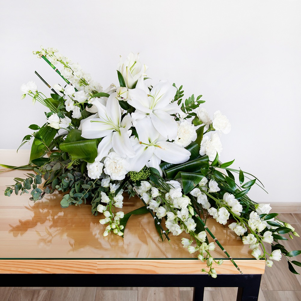 Express your respect and condolences with this elegant white funeral spray. A composition of lilies, roses, lisianthus, carnations, and chrysanthemums in memory of a loved one.