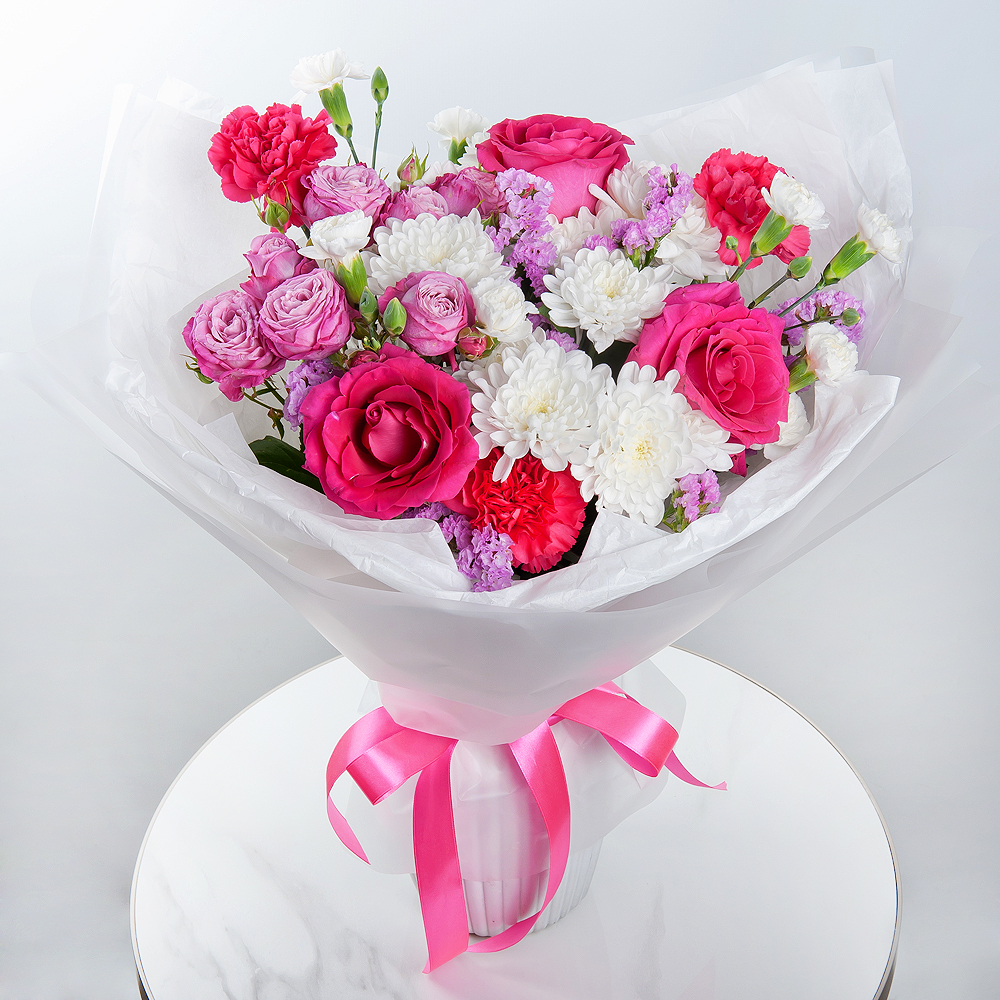 In this bouquet, everything reminds of a romantic evening in Venice. Delicate pink roses, peony-like bush roses, chrysanthemums, and carnations, complemented by statice, create an atmosphere of refined elegance. Modern packaging emphasizes the beauty of this bouquet, which will be the perfect gift to convey your romantic feelings.