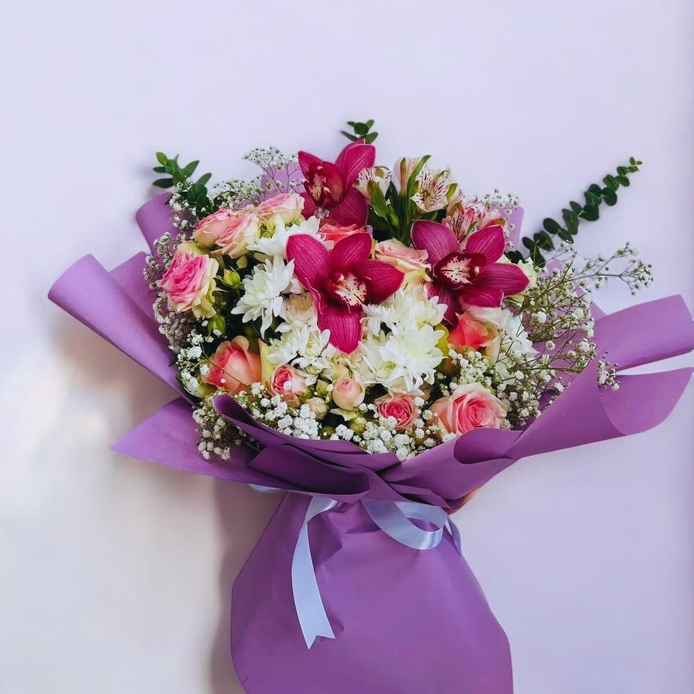Beautifully wrapped bouquet featuring 3 pink cymbidium orchid buds, 5 stems of white chrysanthemums, 5 pink roses, 3 pink spray roses, 4 stems of pink alstroemeria, with white gypsophila and eucalyptus.