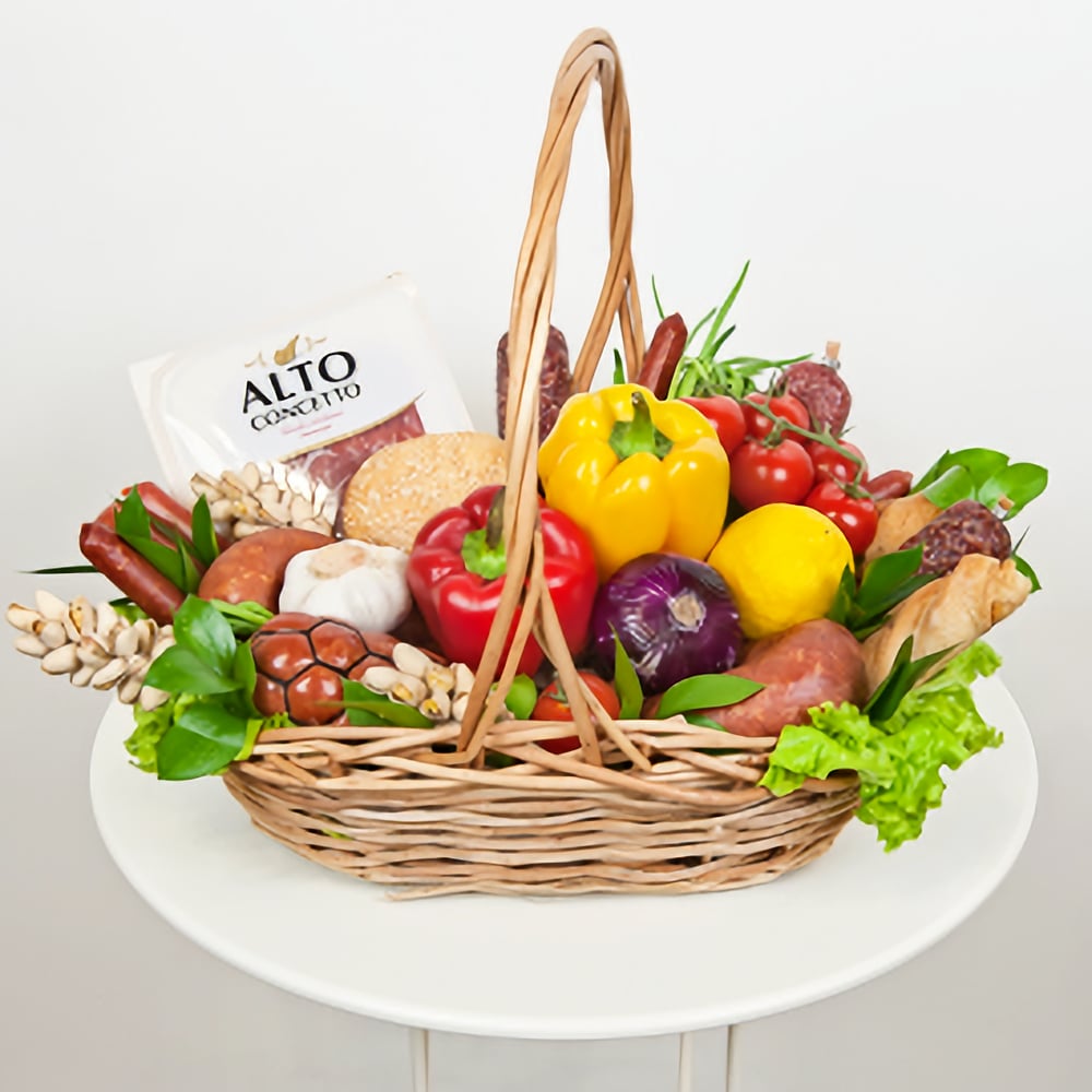 It's hard to imagine a gift more luxurious than this delightful basket, filled with splendid meat snacks and gifts of nature! An assortment of smoked sausages, the piquancy of spicy garlic and nuts, the crispy crust of fresh baguette, and the juiciness of fresh vegetables: that's the recipe for an excellent gift for a real man.