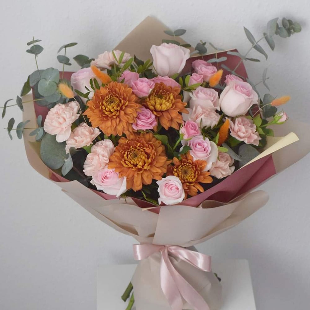 Delicate bouquet of incredible beauty. Orange chrysanthemums harmonize harmoniously with creamy roses and carnations.