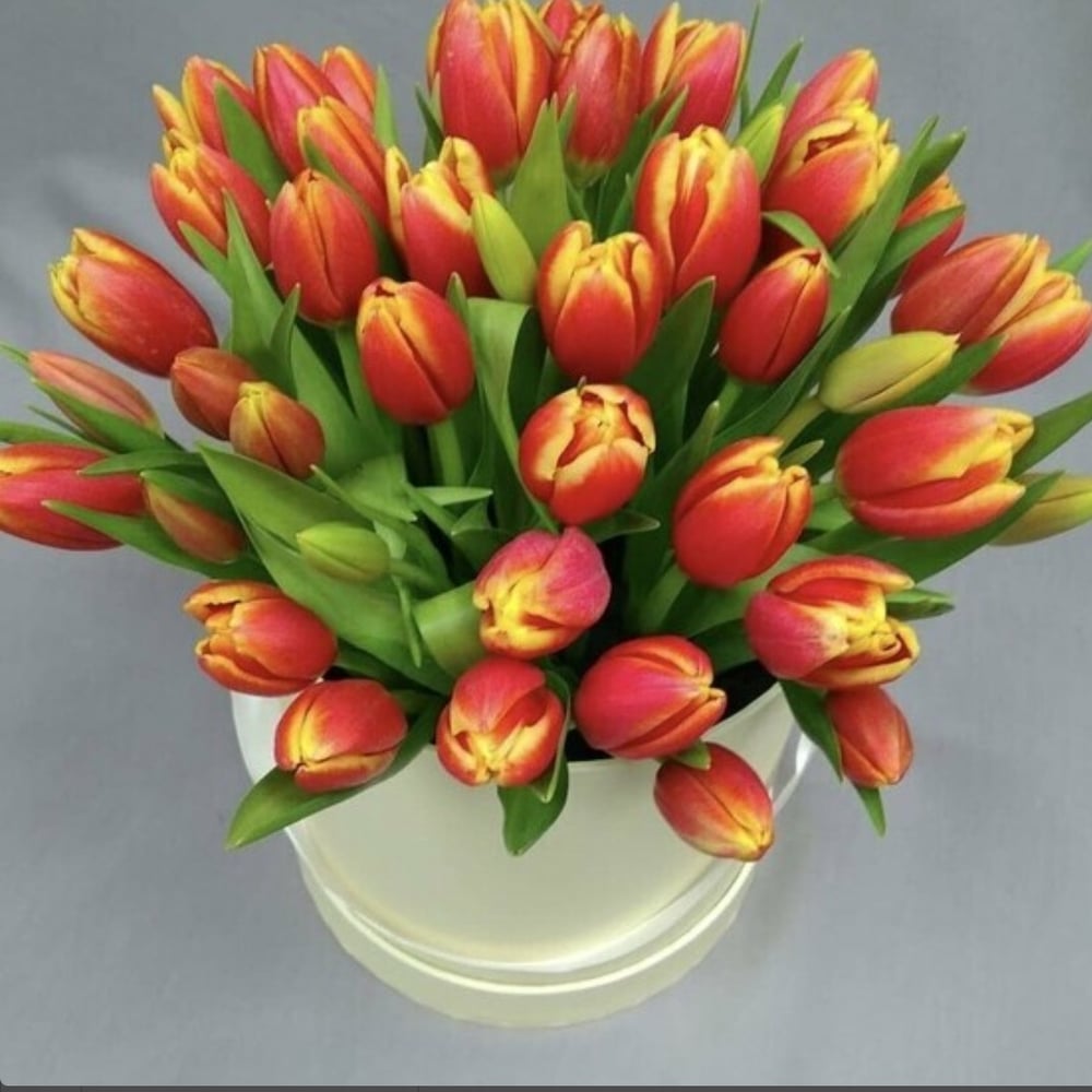 Hat box with flowers 'Fire Tulips'
