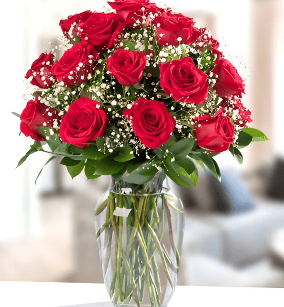 Elegant vase with 24 red roses and gypsophila, a classic symbolizing eternal love and sophistication. ❤️🌹✨ Floral arrangement: 24 red roses Note: Reference image. Flowers are subject to availability depending on the season.
