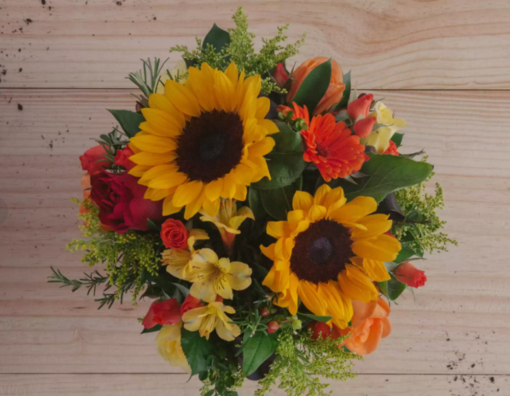 Flower mix with: Colombian roses, local roses, spray roses, sunflower, hydrangeas.